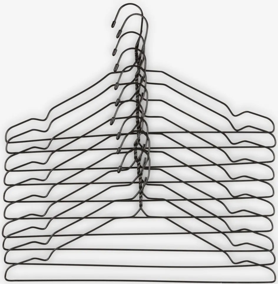 Lot de 10 cintres noirs en acier avec un design très fin et peu encombrant. Idéal pour garder les vêtements légers bien organisés. l21 x L43 cm