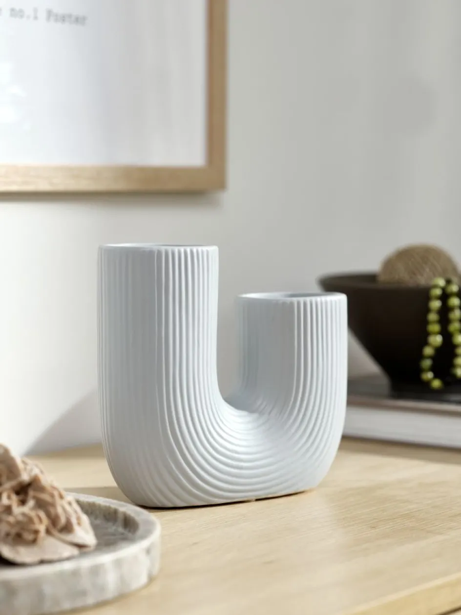 Vase en grès bleu clair avec un design en forme de U et une surface nervurée. Ce vase unique ajoute une touche contemporaine et artistique à votre décoration intérieure. Idéal pour exposer des fleurs ou comme pièce décorative seule. l18 x L6 x H17 cm