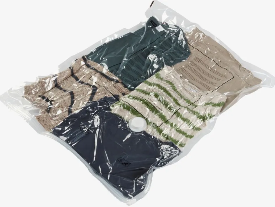 Sac sous vide hermétique et étanche avec double fermeture à glissière. Idéal pour le rangement compact de vêtements saisonniers et d’autres objets de taille moyenne à la maison ou en voyage. Remplissez le sac et aspirez l’air à l’aide d’un aspirateur. l60 x L80 cm