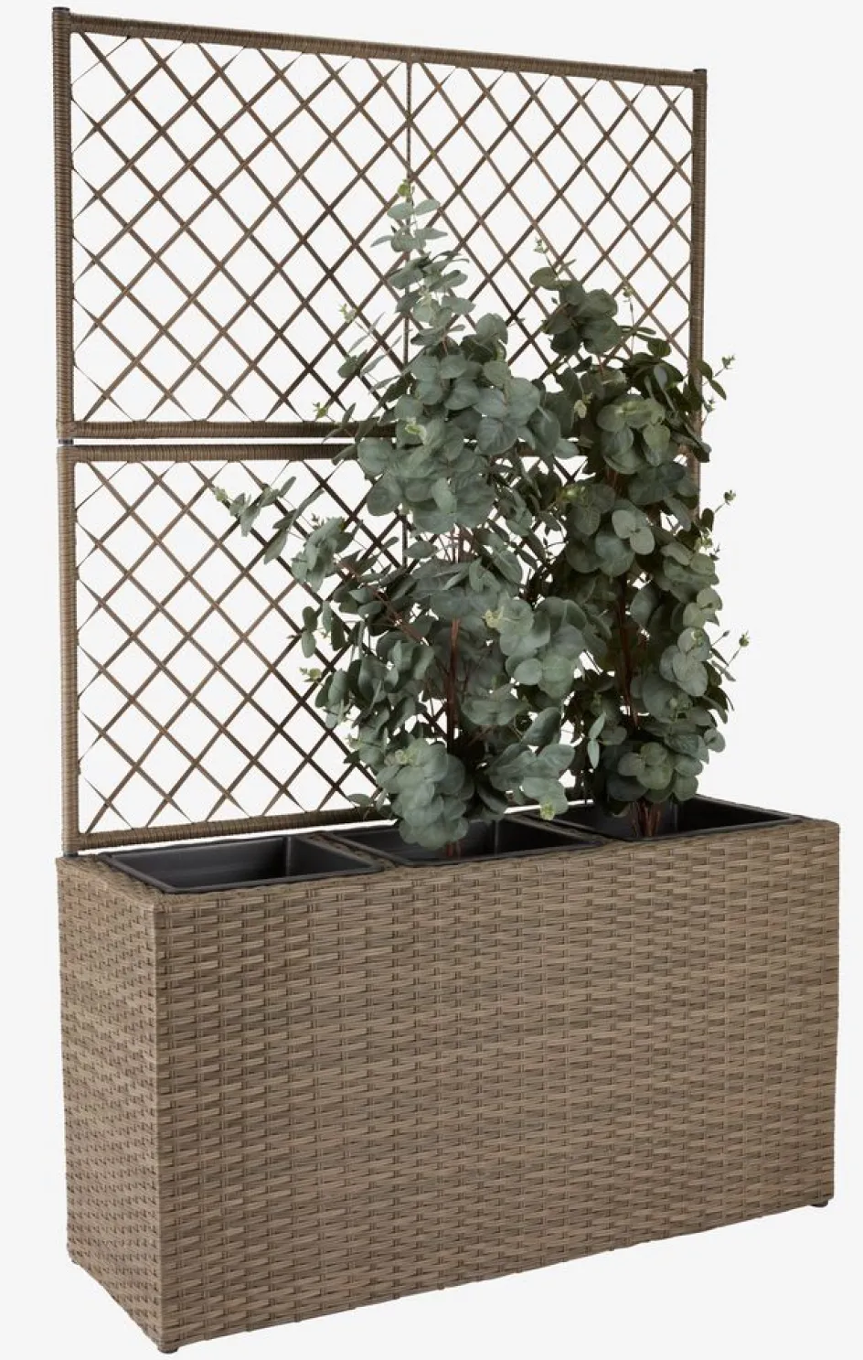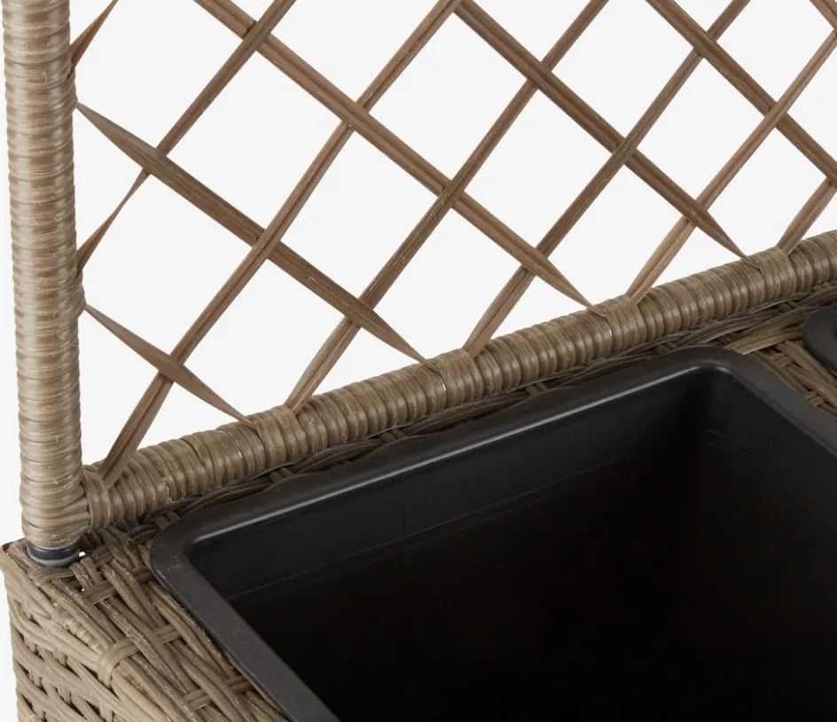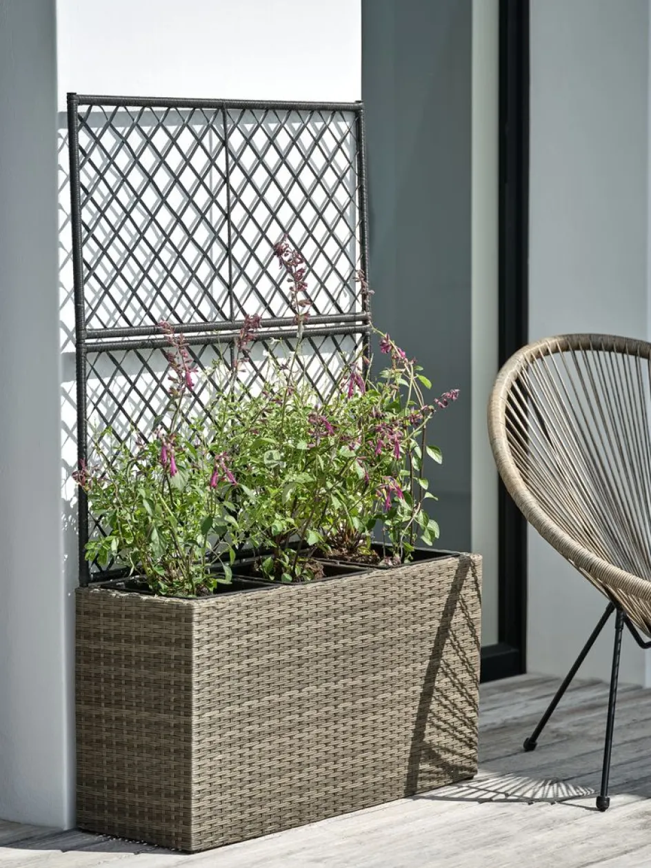 Jardinière avec treillis, en polyrotin et acier galvanisé. Idéale pour créer une clôture verte autour de votre terrasse ou pour diviser votre espace extérieur. Le treillis offre un support pour les plantes grimpantes et donne un bel effet décoratif lorsqu’il est recouvert. Un trou de drainage peut être facilement créé pour permettre à l’excès d’eau de s’écouler. l30 x L83 x H130 cm