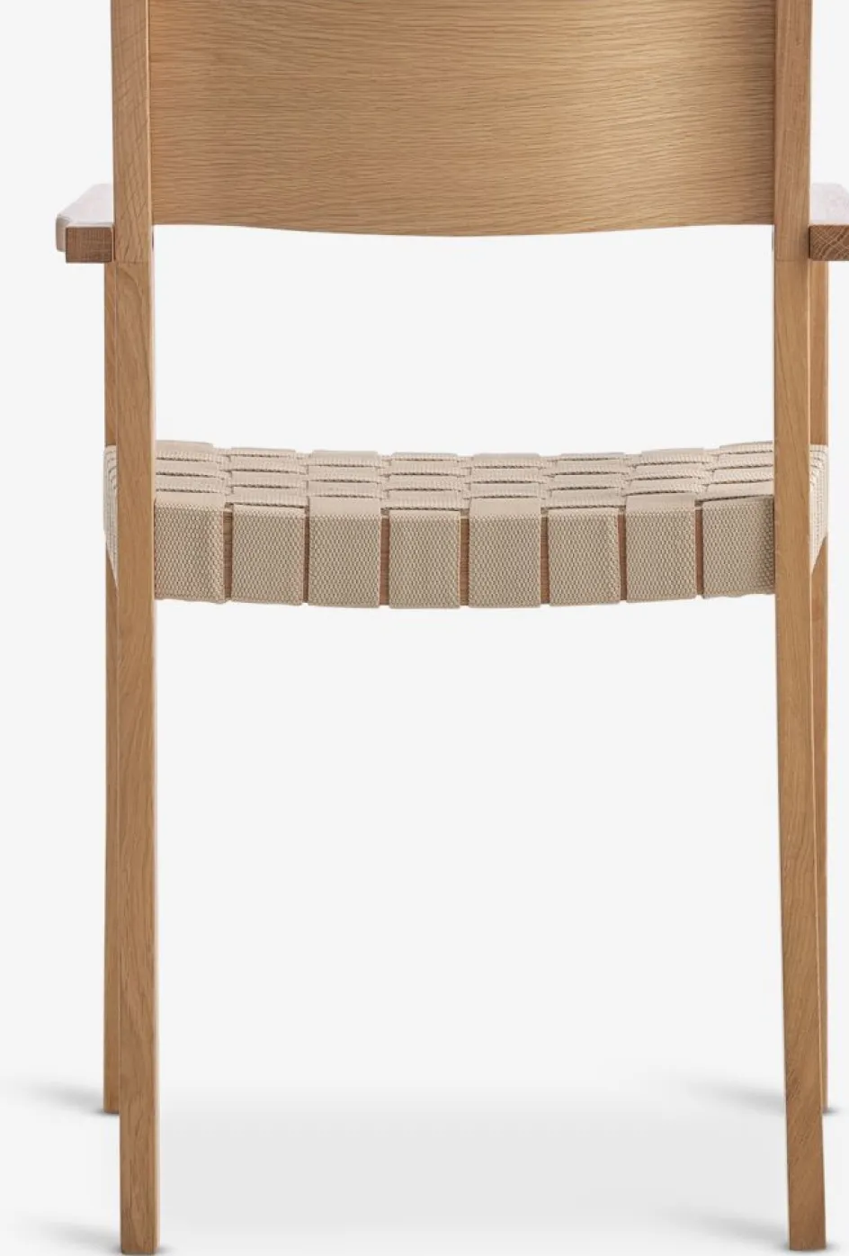 Chaise de salle à manger avec accoudoirs offrant un soutien et un confort supplémentaires. L’assise est en polyester tissé et la structure est en chêne massif. Le bois est laqué pour une plus grande durabilité.