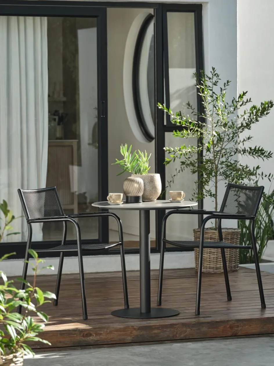 Table bistrot ronde avec un plateau gris en pierre frittée. Pied assorti en acier peint par poudrage. La pierre frittée résiste aux rayures, aux taches et à la chaleur. Ø70 x H72 cm
