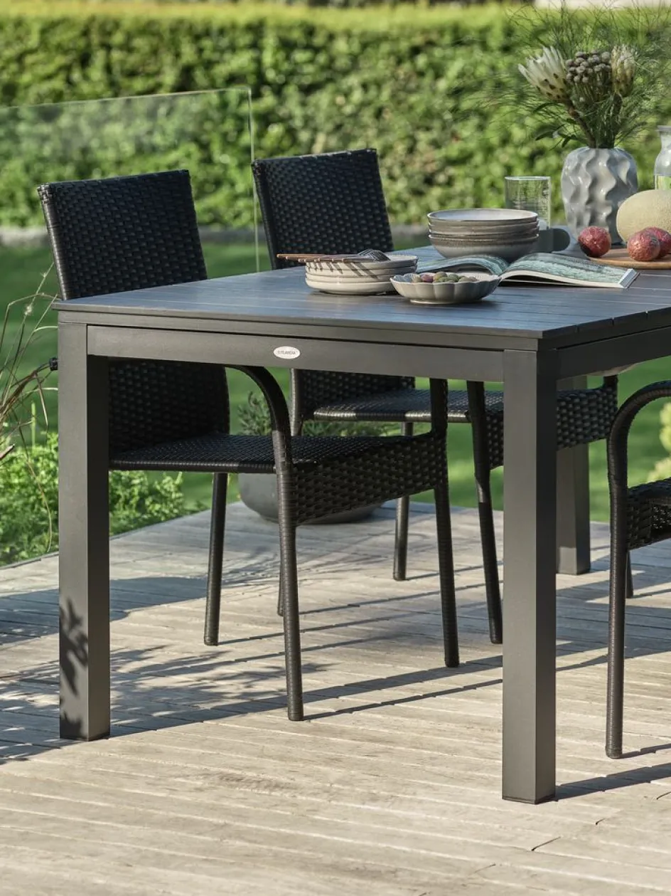 Table de jardin extensible avec mécanisme d’extraction. Comprend 2 rallonges pouvant être rangées sous le plateau. La table de jardin a un plateau noir en imitation bois. Cadre et pieds assortis en aluminium peint par poudrage. L’imitation bois a l’apparence et la texture du bois naturel sans nécessiter d’entretien. L’aluminium est un matériau léger et robuste qui ne rouille pas. Vous pouvez facilement rallonger la table jusqu’à 229 ou 276 cm pour accueillir plus de personnes. l95 x L172 x H76 cm