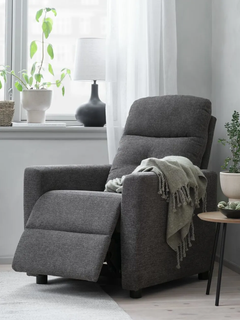 Fauteuil inclinable en tissu. Coussin d’assise avec ressorts ensachés et rembourrage en mousse. Coussin de dossier en mousse. Avec mécanisme d’inclinaison progressive et repose-pieds intégré. l75 x H100 x P91 cm