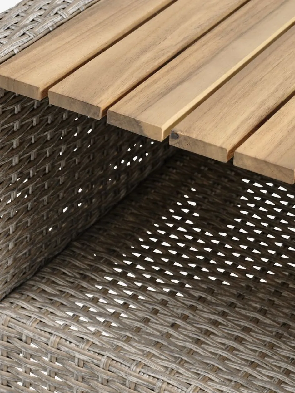 La table lounge est dotée d’un plateau en bois dur FSC® huilé qui lui offre une durabilité, une longévité et une beauté naturelles. Le bois est traité à l’huile afin de le protéger et de rehausser sa couleur naturelle. Il est recommandé de huiler régulièrement le bois afin de préserver sa couleur et de le protéger de l’humidité.