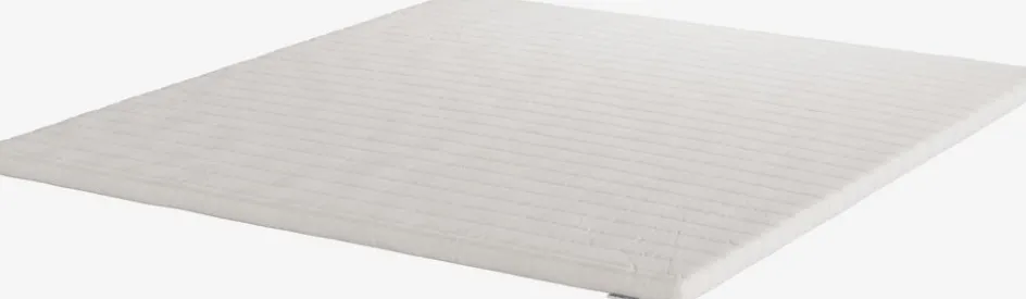 Surmatelas 160×200 cm de 4 cm d’épaisseur avec noyau en mousse polyéther. Enveloppe lavable douce en 100% microfibre polyester (100% recyclé) avec léger matelassage.