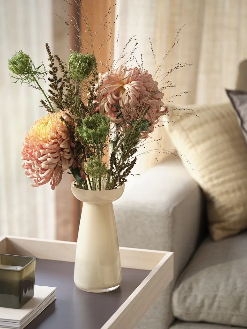 Vase en verre lisse à la forme moderne et à la couleur vanille chaude. Son design sculptural le rend idéal pour mettre en valeur des bouquets ou pour être utilisé seul comme objet de décoration. Ø11 x H22 cm