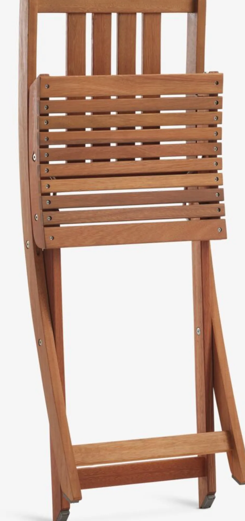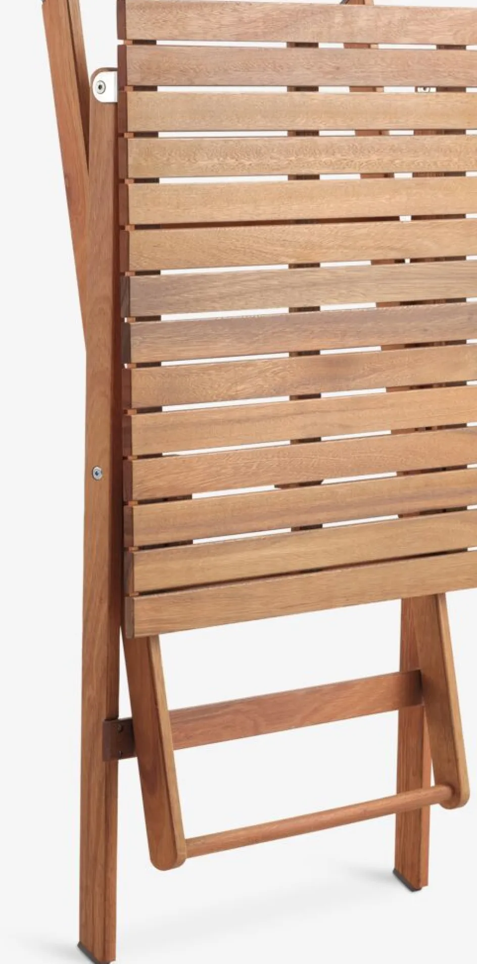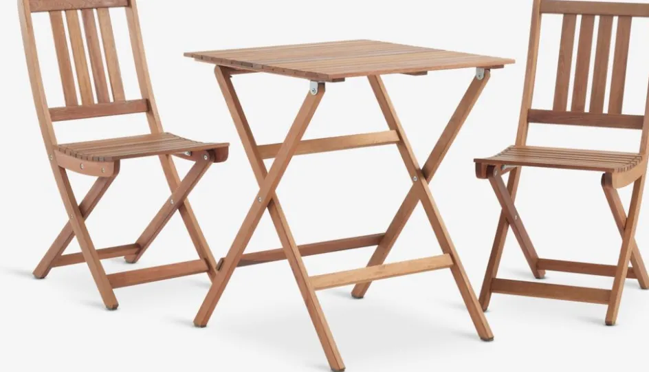 Ensemble bistrot 2 personnes. Table: Bois dur FSC® huilé. Pliable. l62 x L62 x H74 cm. Chaise: Bois dur FSC® huilé. Pliable.