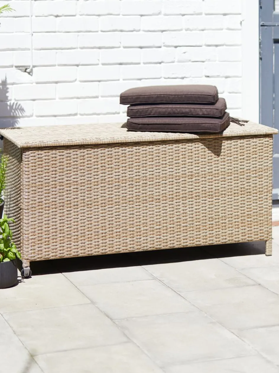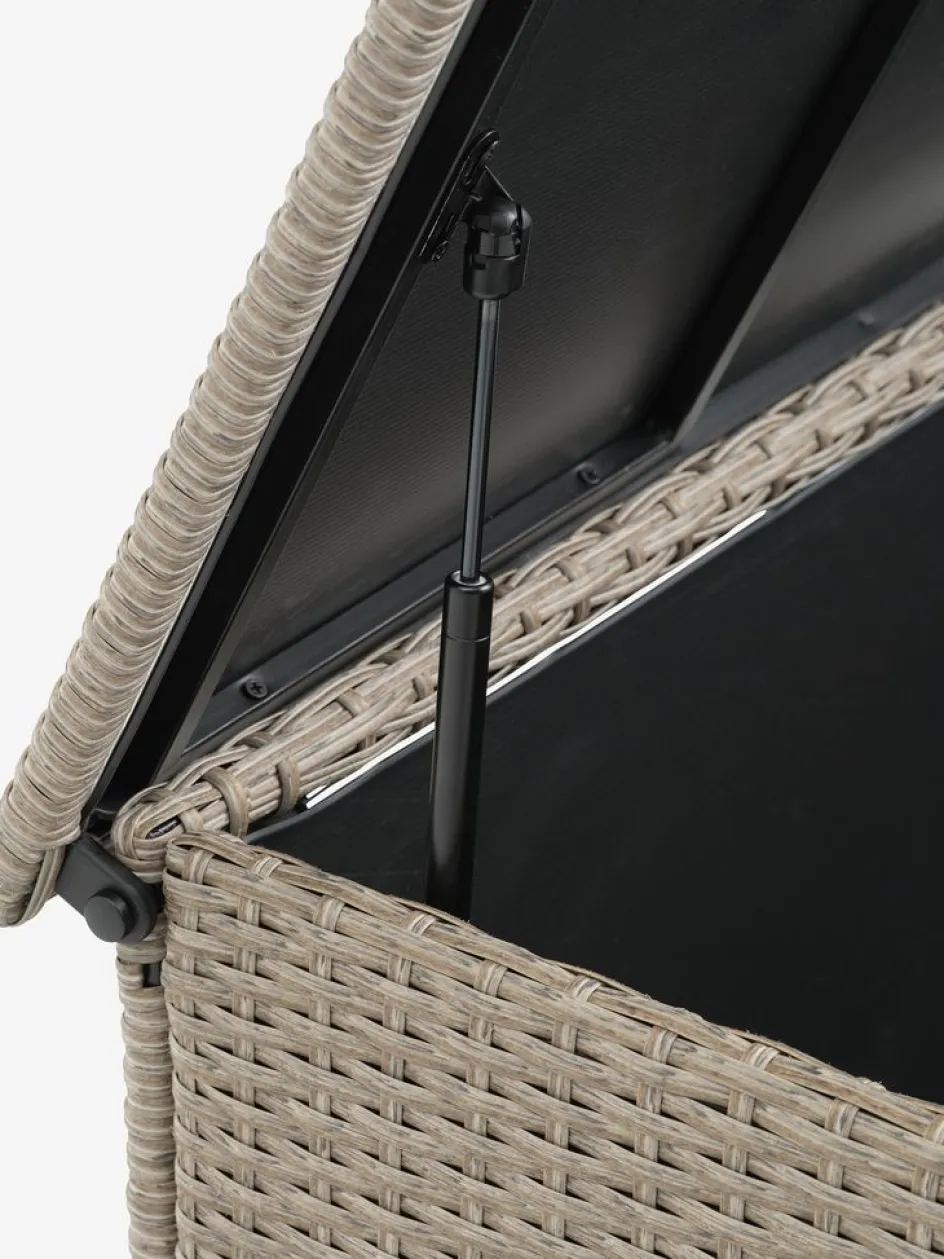 Coffre à coussins en acier et polyrotin. Avec couvercle hydraulique facile à utiliser, roulettes et poignée de tirage. l133 x H64 x P55 cm